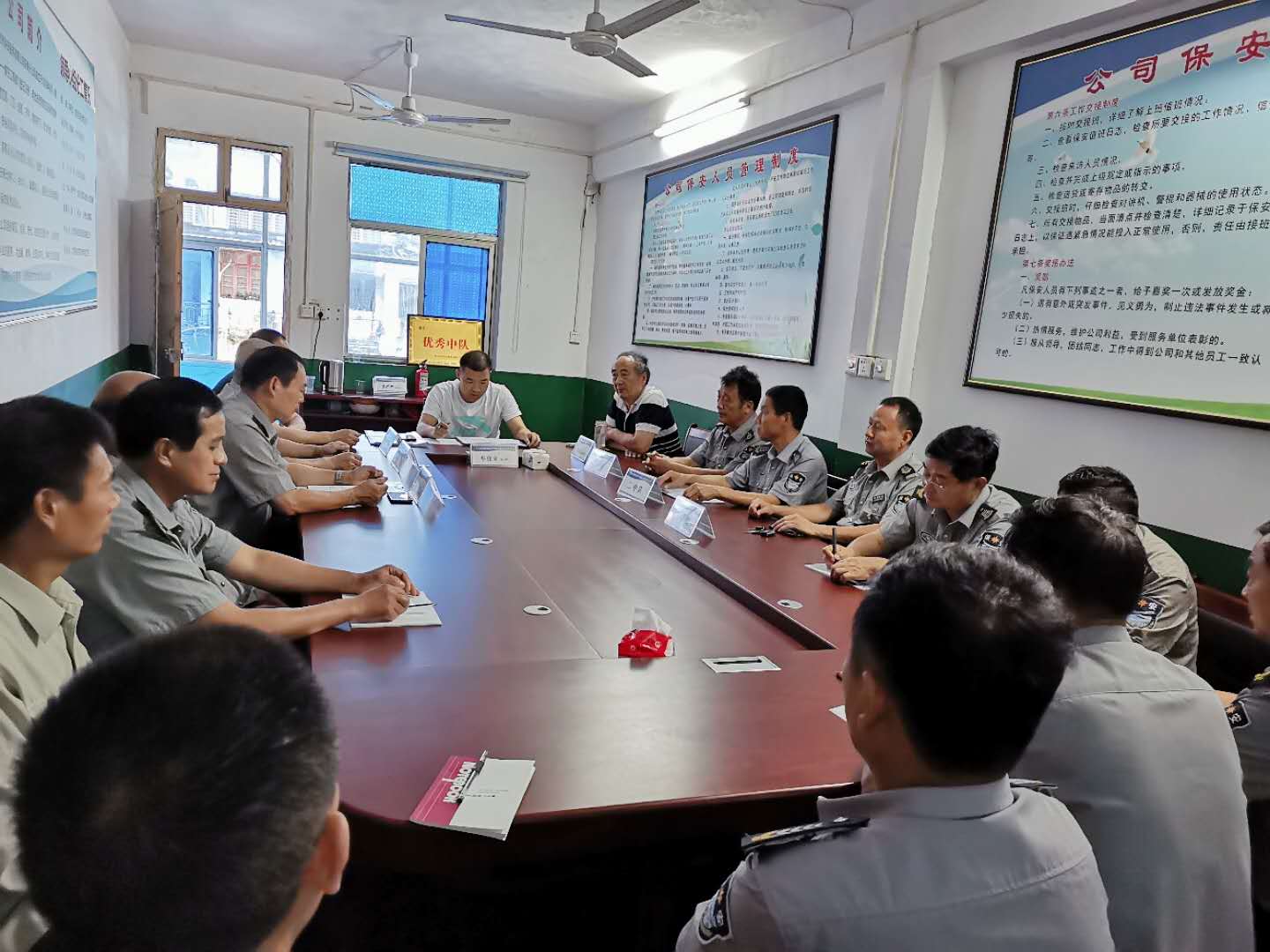 7月26日上午,新蔡县分公司召开了半年度工作会议,会议内容:对上半年的工作进行总结和下半年的工作进行安排部署。 会议开始由公司车经理给各岗点组长宣读上半年各岗点工作中出现的问题点。车经理要求,对于存在的问题点希望各岗点组长及时整改,要严格按照公司的规章制度去执行。对于7月份实施的服装整顿,和文明用语整顿,各岗点的保安有很明显的改变和进步,希望大家能继续保持,要全身心投入工作中,要树立严谨、仔细的工作作风,为用人单位提供更好的服务!