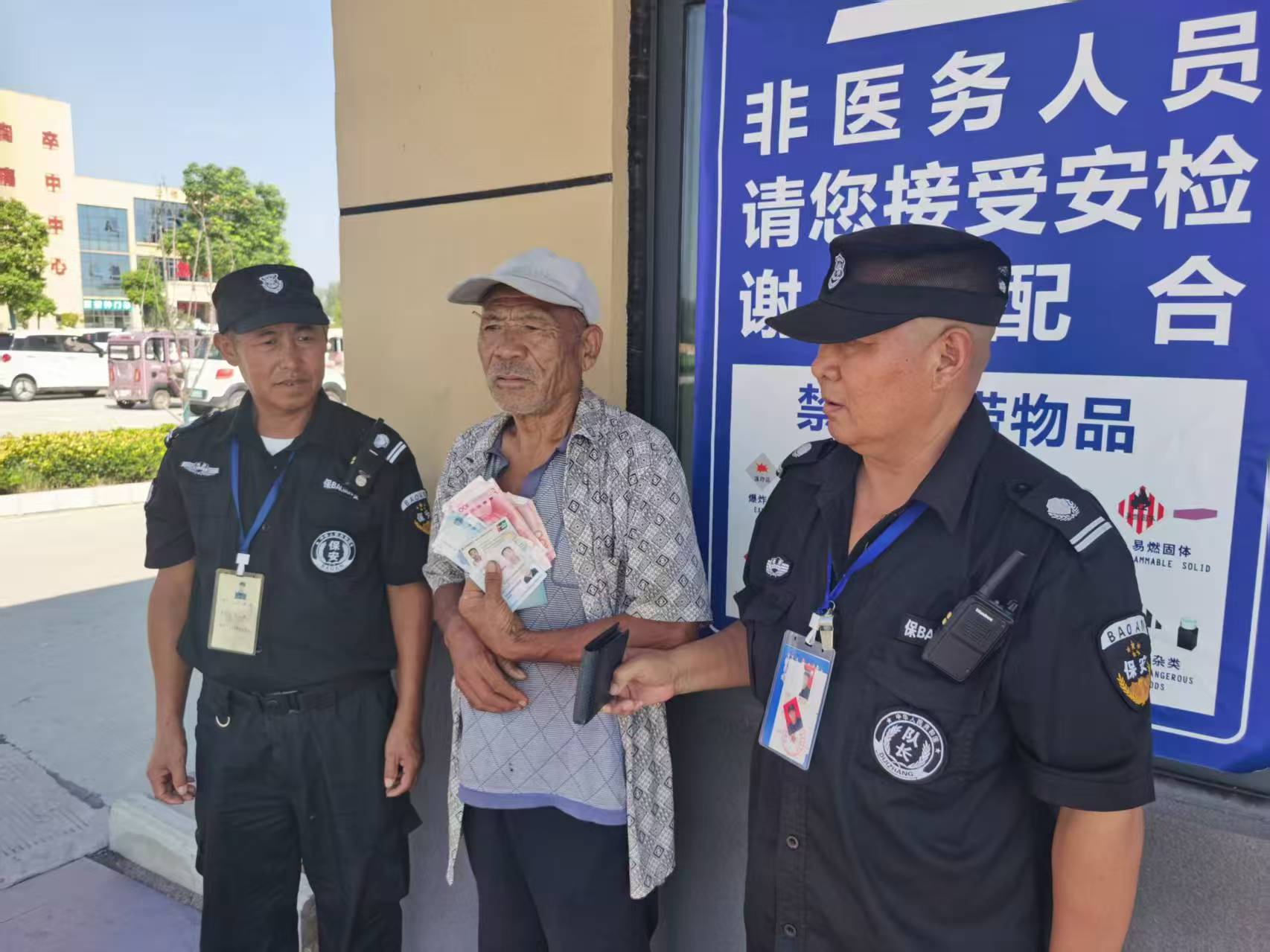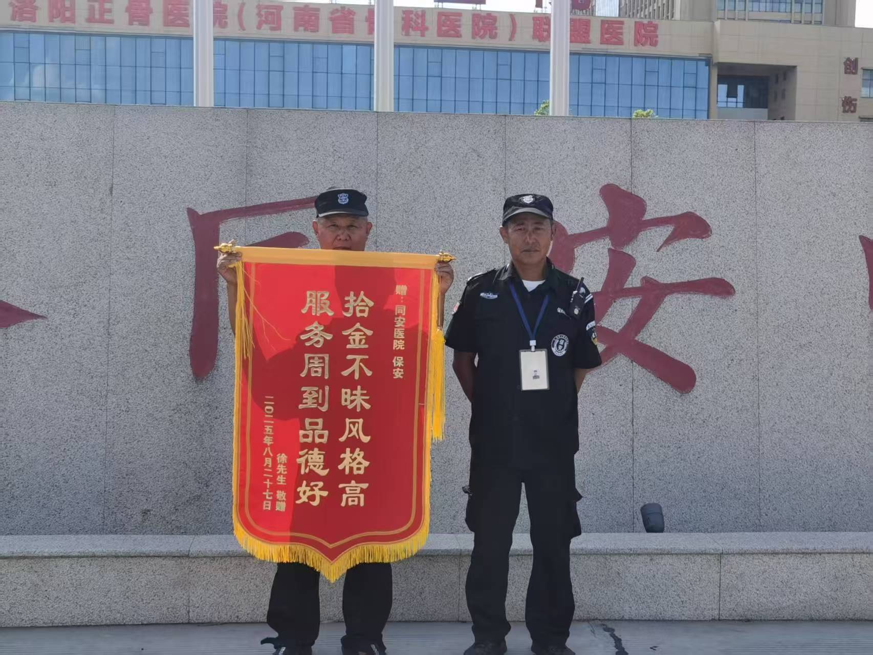 2025年8 月 26 日下午,新蔡县分公司同安医院岗点保安杨峰同志,在园区巡逻时,经过电动车充电车棚,查看有无违规充电安全隐患想象,看到一个钱包并且证件散落在地上,他第一时间上报给带班班组长,同班组长一起捡起钱包,里面有多张身份证社保卡以及现金。汇报告给保卫科负责人,并把照片发到医院各科室工作群寻找失主。保安队员妥善保管失主物品,多方打听,积极协助寻找失主,最终于第二天找到看病的失主徐先生,将财物完整归还失主徐先生。徐先生为表感激之情,特赠锦旗一面,以表彰杨峰同志拾金不昧的高尚品德、尽职尽责的优秀品质。