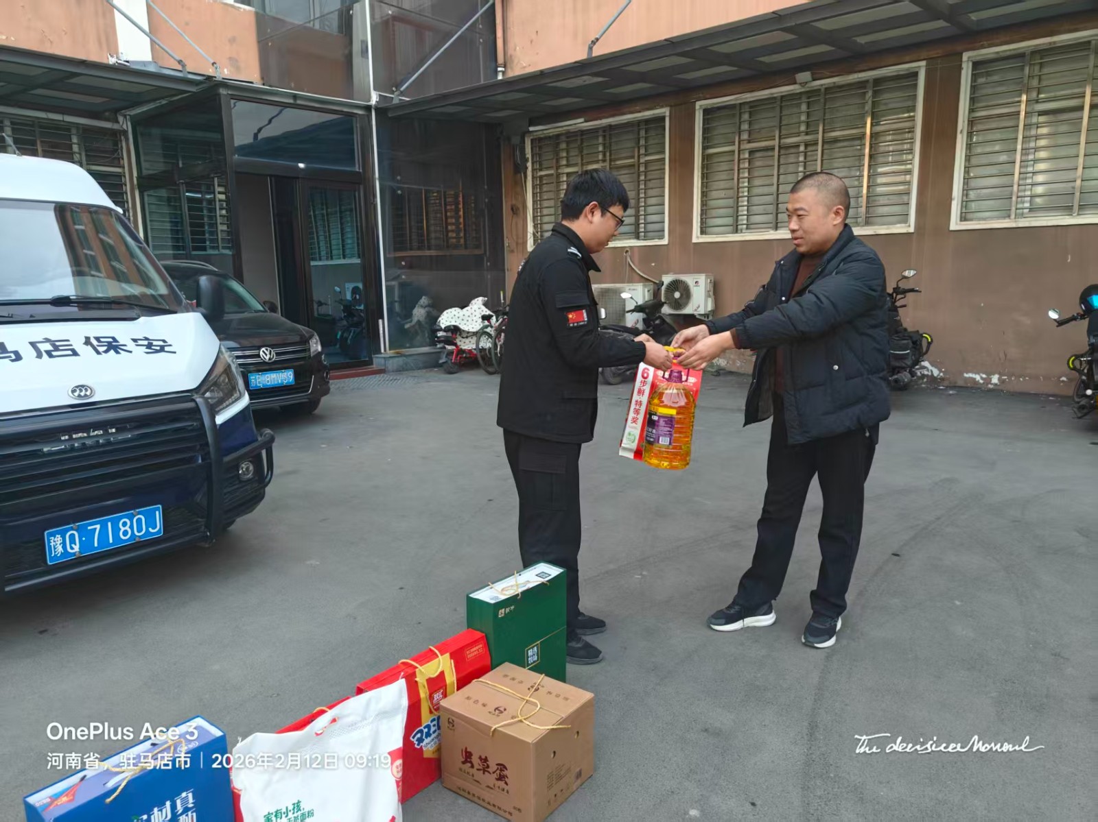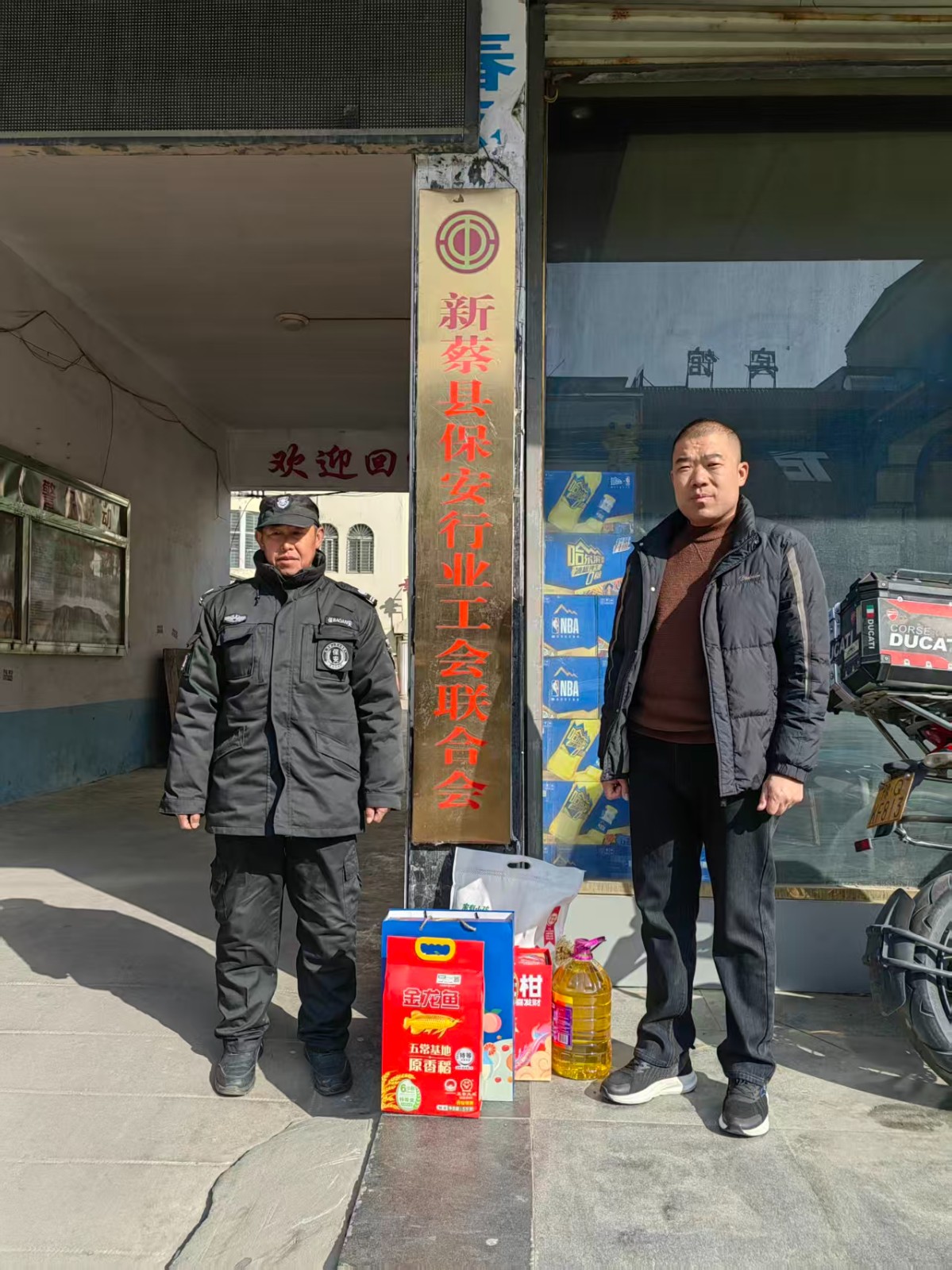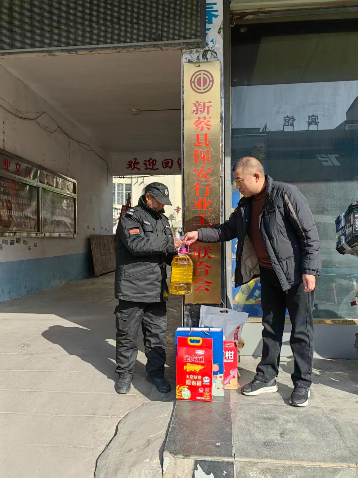 2月12日上午,新蔡县分公司经理车自立对市保安协会慰问礼品,送达到新蔡押运大队王亚男、新蔡分公司保安牛胜利手中,同时也送来了分公司的问候和关怀。