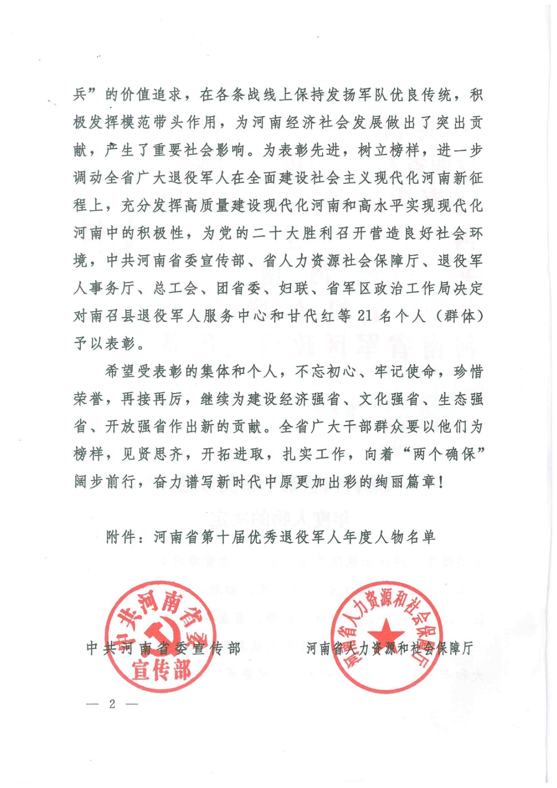 2022年8月1日,在“永远的兵”河南省第十届优秀退役军人年度人物评选表彰活动中,98彩票网(集体)被中共河南省委宣传部、河南省人力资源和社会保障厅、河南省退役军人事务厅、河南省总工会、共青团河南省委、河南省妇女联合会、河南省军区政治工作局表彰为“‘年度人物’提名奖”。