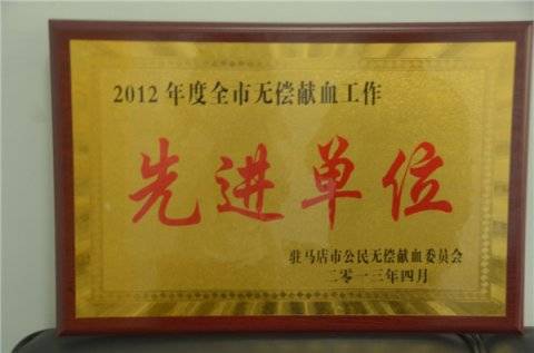 被驻马店市公民无偿献血委员会授予2012年度全市无偿献血工作先进单位